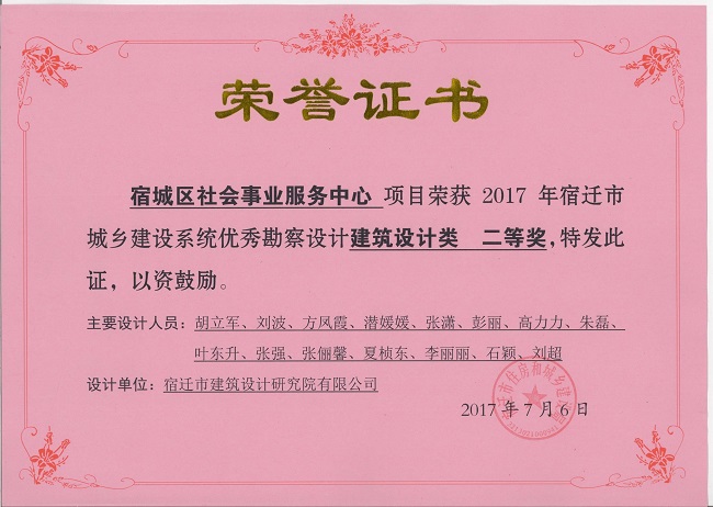 1、宿城區(qū)社會(huì)事業(yè)服務(wù)中心項(xiàng)目中獲建筑設(shè)計(jì)類二等獎(jiǎng)